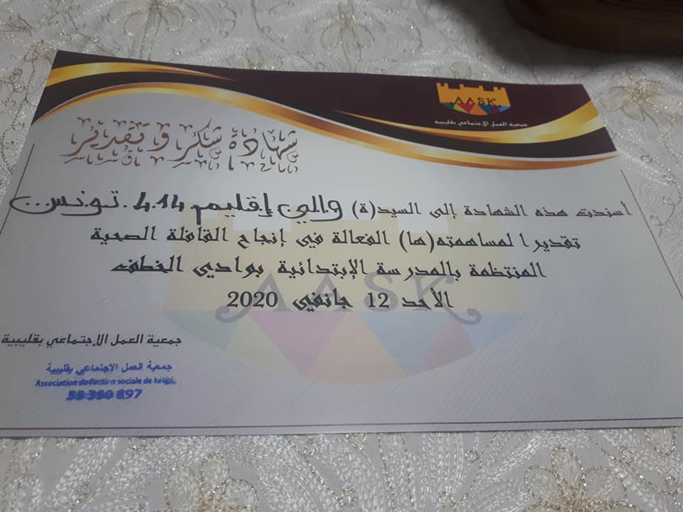 Un grand merci à Madame Rafiaa Limam Baouendi présidente de l’association de l’action sociale de kelibia pour son accueil chaleureux son hospitalite et la bonne préparation de la caravane de santé pour les élèves des écoles Oued Elkhatef de la délégation de Kélibia gouvernorat de Nabeul.